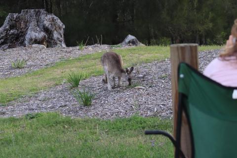Zusammen mit den Campern flanierten auf dem Platz auch einige unserer hoppsenden Lieblinge, die Kängurus und Wallabys herum. Während Philip sich um Kontaktaufnahme bemühte und versuchte einen der Gesellen (nein, keinen der Camper, sondern ein Känguru) dazu zu bewegen, in einen Beutel zu hoppsen, versuchte ich mein Glück beim Bemalen der Autotür. Also angeblich sollen Kängurus ja einfach in einen ihnen vorgehaltenen Beutel reinschlüpfen, da sie das wohl für den Beutel ihrer Mama halten. Scheinbar funktioniert das entweder nur nicht mit Einkaufsbeuteln von Coles oder aber das Känguru war einfach schon viel zu erwachsen für den Spaß.