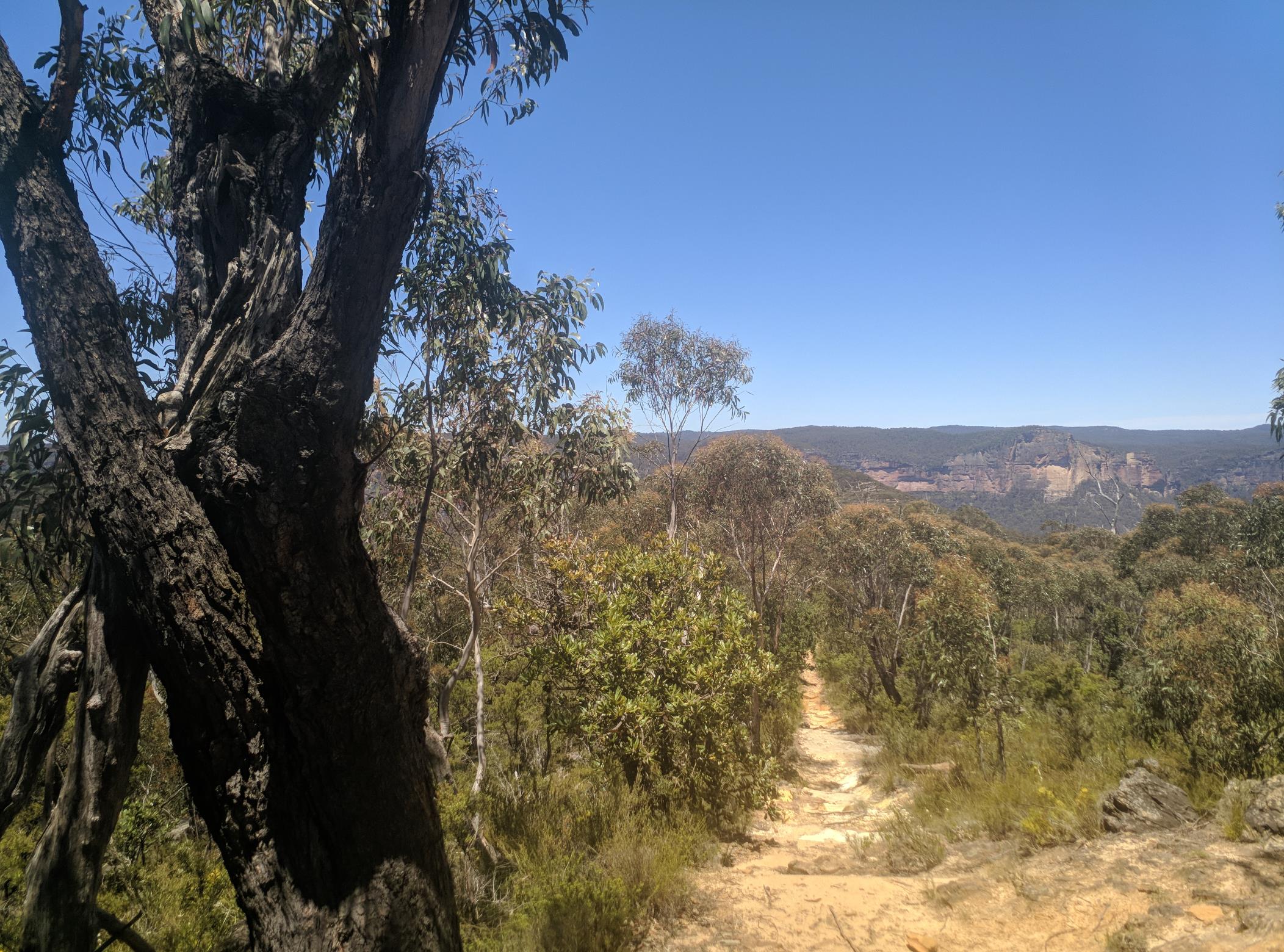 An diesem von klimatischer Seite aus betrachtet etwas kühleren Tag, nutzten wir die Gelegenheit eine kleine Wanderung zu unternehmen. Es zog uns wieder in die ‘Blue Mountains’, diesmal zum ‘Walls lookout’. Als wir auf der Wegbeschreibung lasen, dass der Weg zu dem Aussichtspunkt 1.5 km lang sei, aber mit einer Dauer von etwa einer Stunde zu rechnen war, konnten wir das nur schwer glauben. Wir ahnten, es könnte etwas steiler bergab und über Stock und Stein gehen. Und so bewahrheitete es sich dann auch. Aber der Weg war ein Traum und das Wetter spielte wunderbar mit. Wir genossen romantische Aussichten und ich konnte zwischendurch sogar ein kleines bisschen klettern.