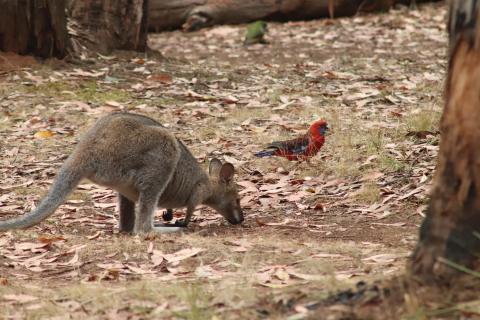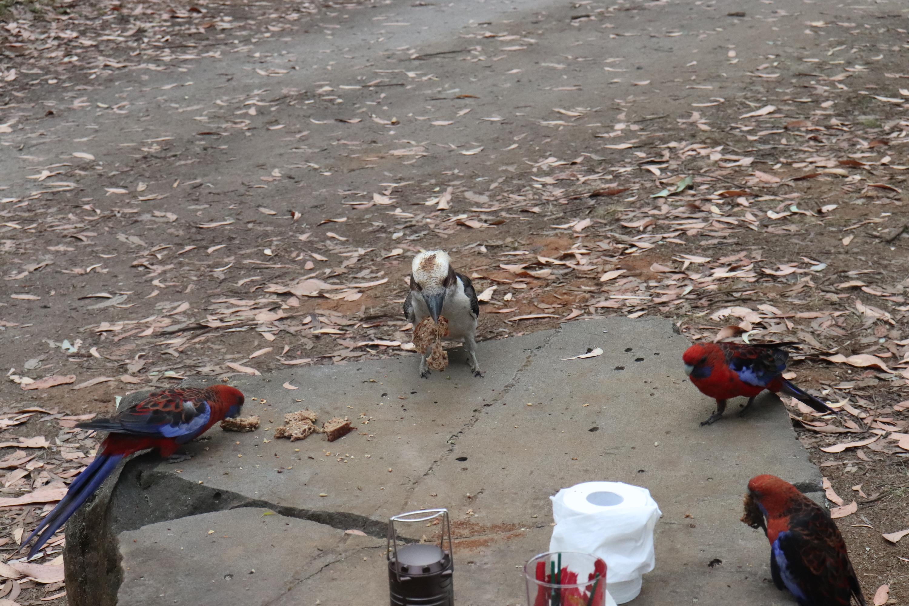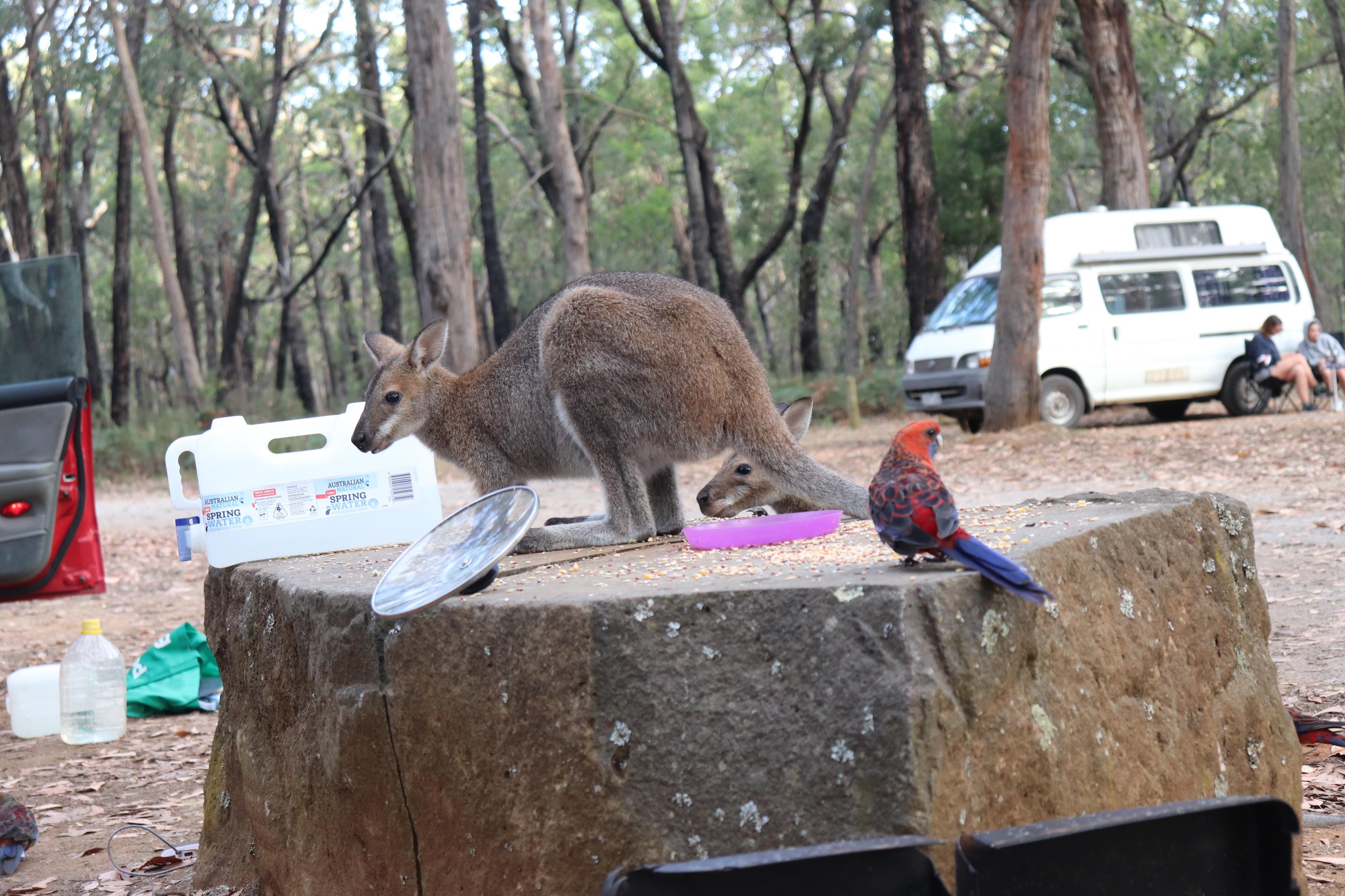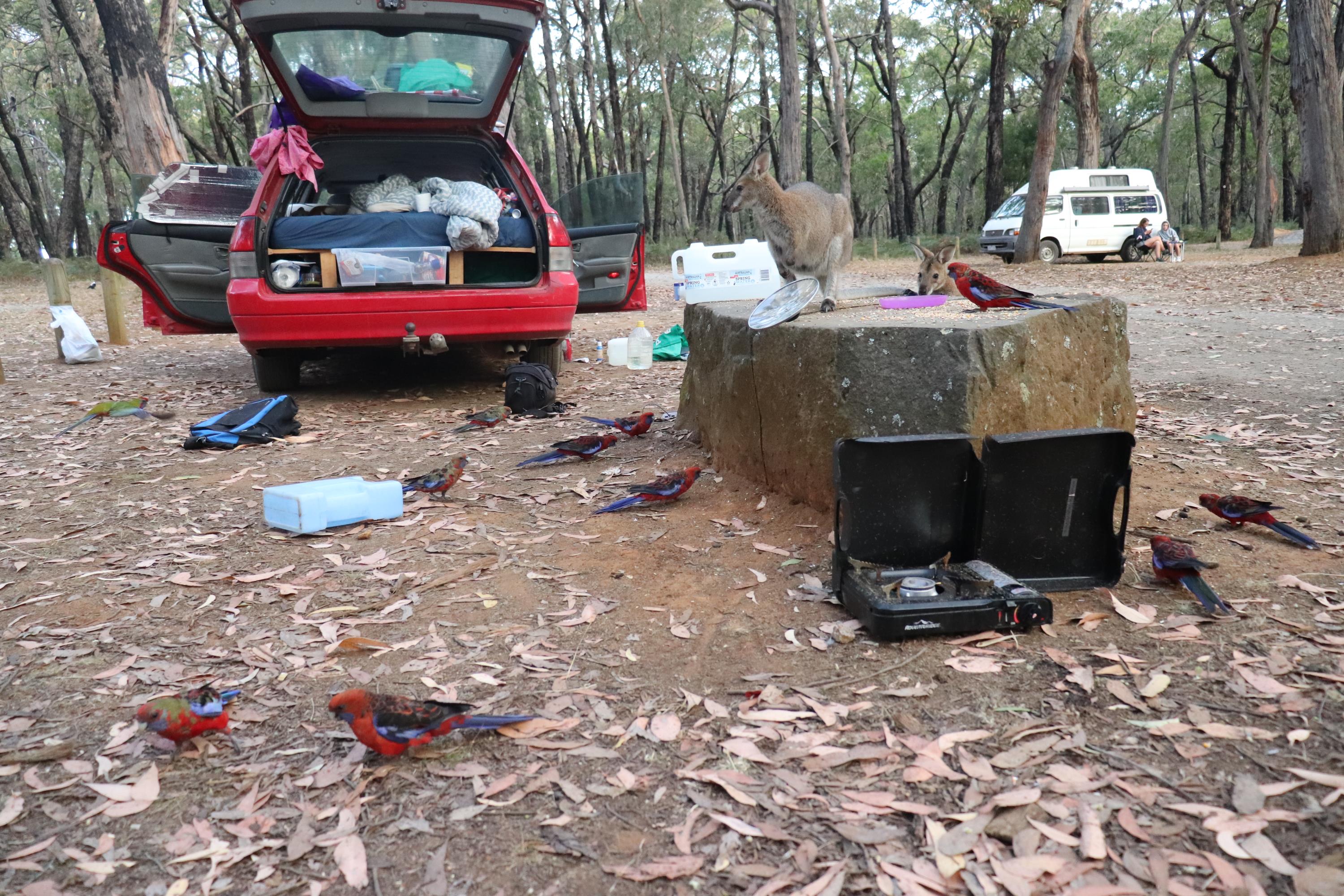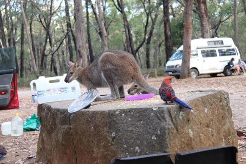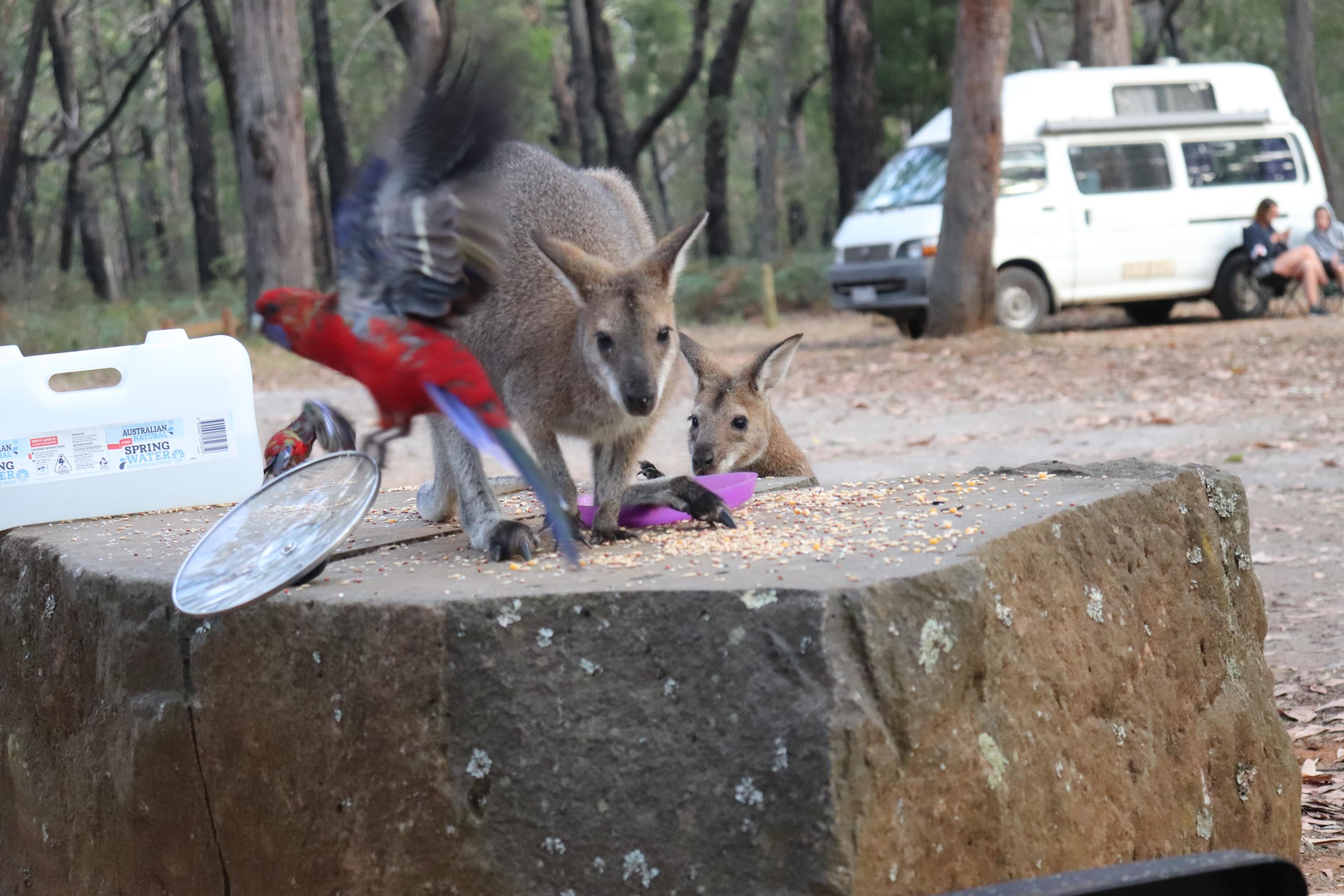 Morgens wurde ich wieder wach durch ein knusperndes Geräusch wach, welches wieder von einem hungrigen Wallaby erzeugt wurde, das sich an der Vogelfutterstange (eigentlich ja, wie der Name sagt, für die Vögel gedacht) gütlich tat. Die Pennantsittiche ließen es sich allerdings nicht nehmen, die Krümel vom Wallaby zu gustieren.😁