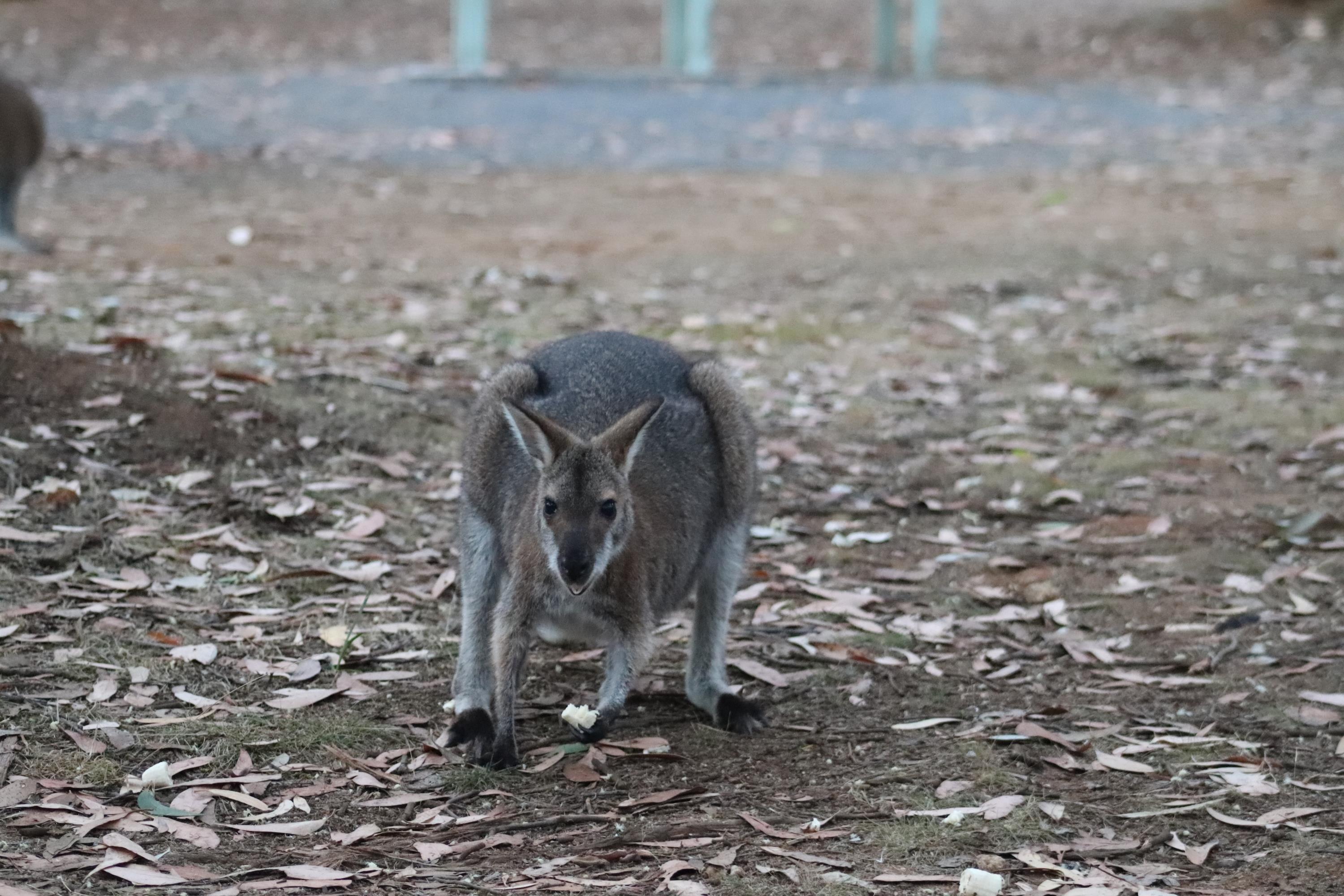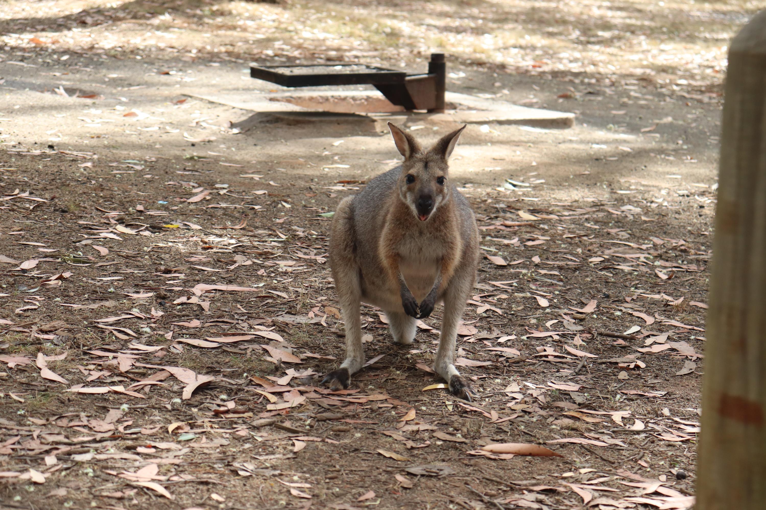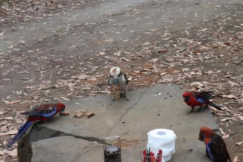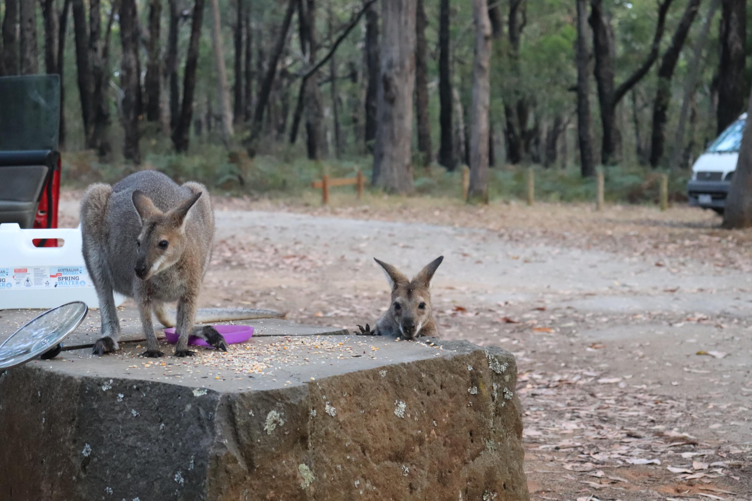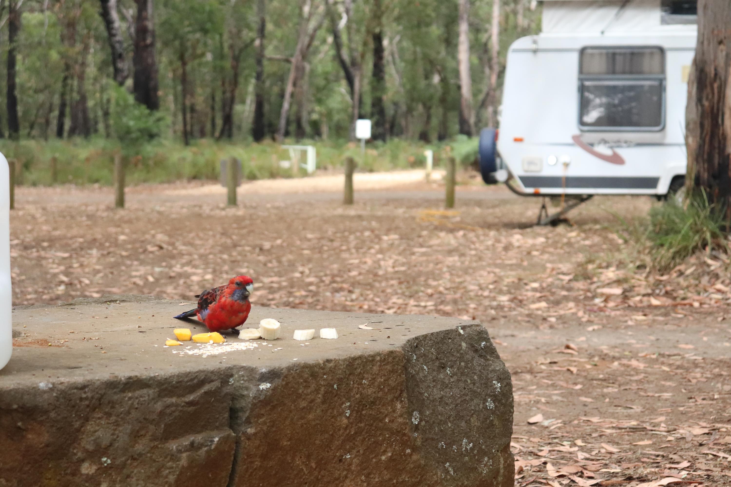 Morgens wurde ich wieder wach durch ein knusperndes Geräusch wach, welches wieder von einem hungrigen Wallaby erzeugt wurde, das sich an der Vogelfutterstange (eigentlich ja, wie der Name sagt, für die Vögel gedacht) gütlich tat. Die Pennantsittiche ließen es sich allerdings nicht nehmen, die Krümel vom Wallaby zu gustieren.😁
