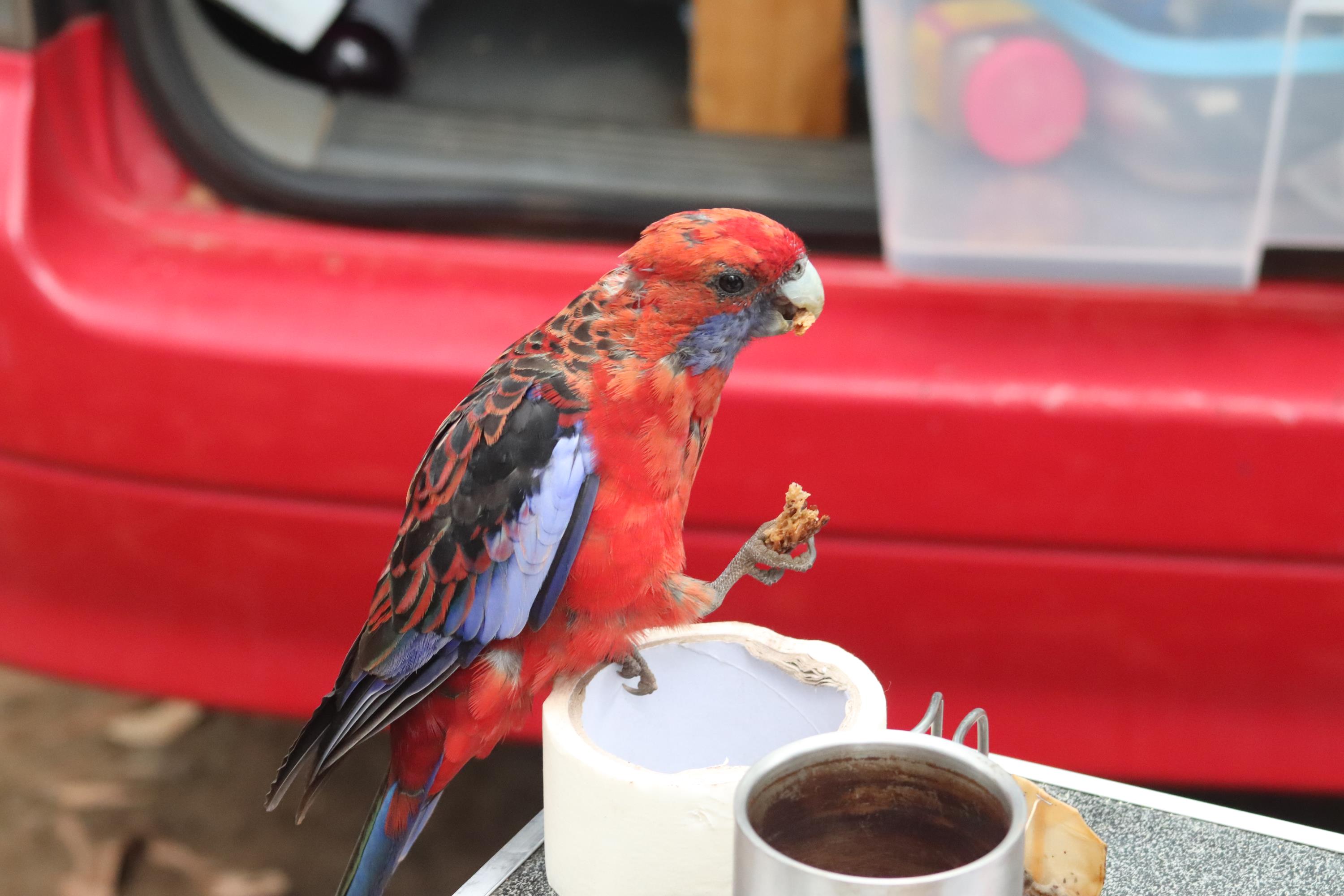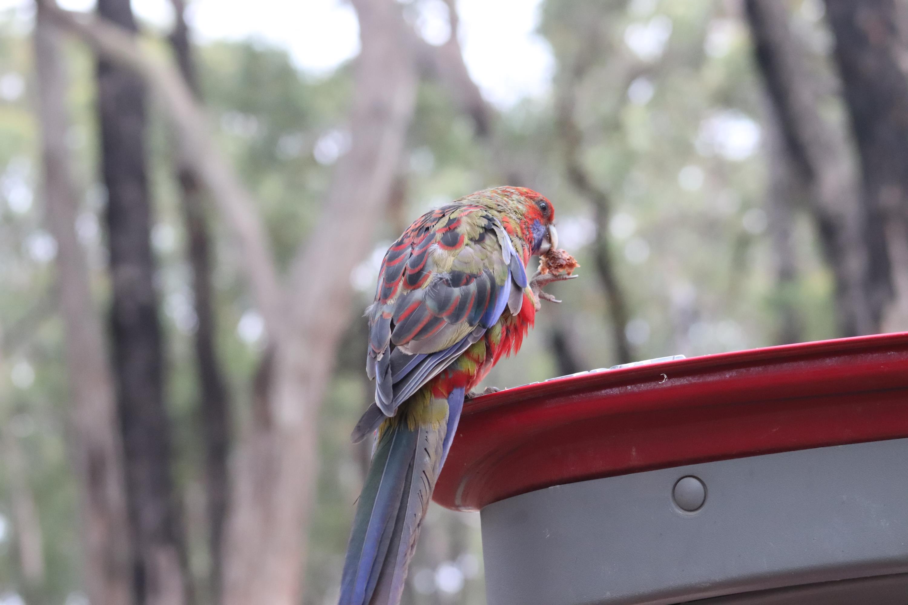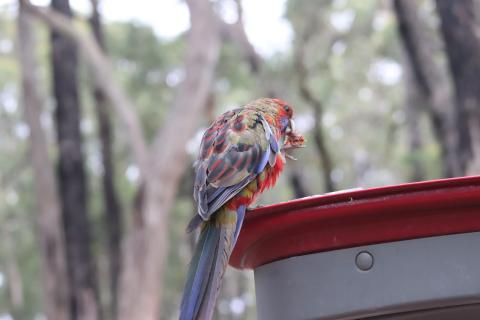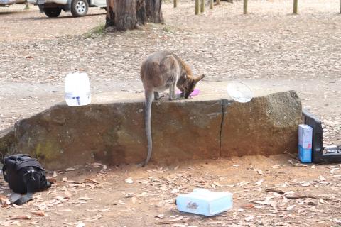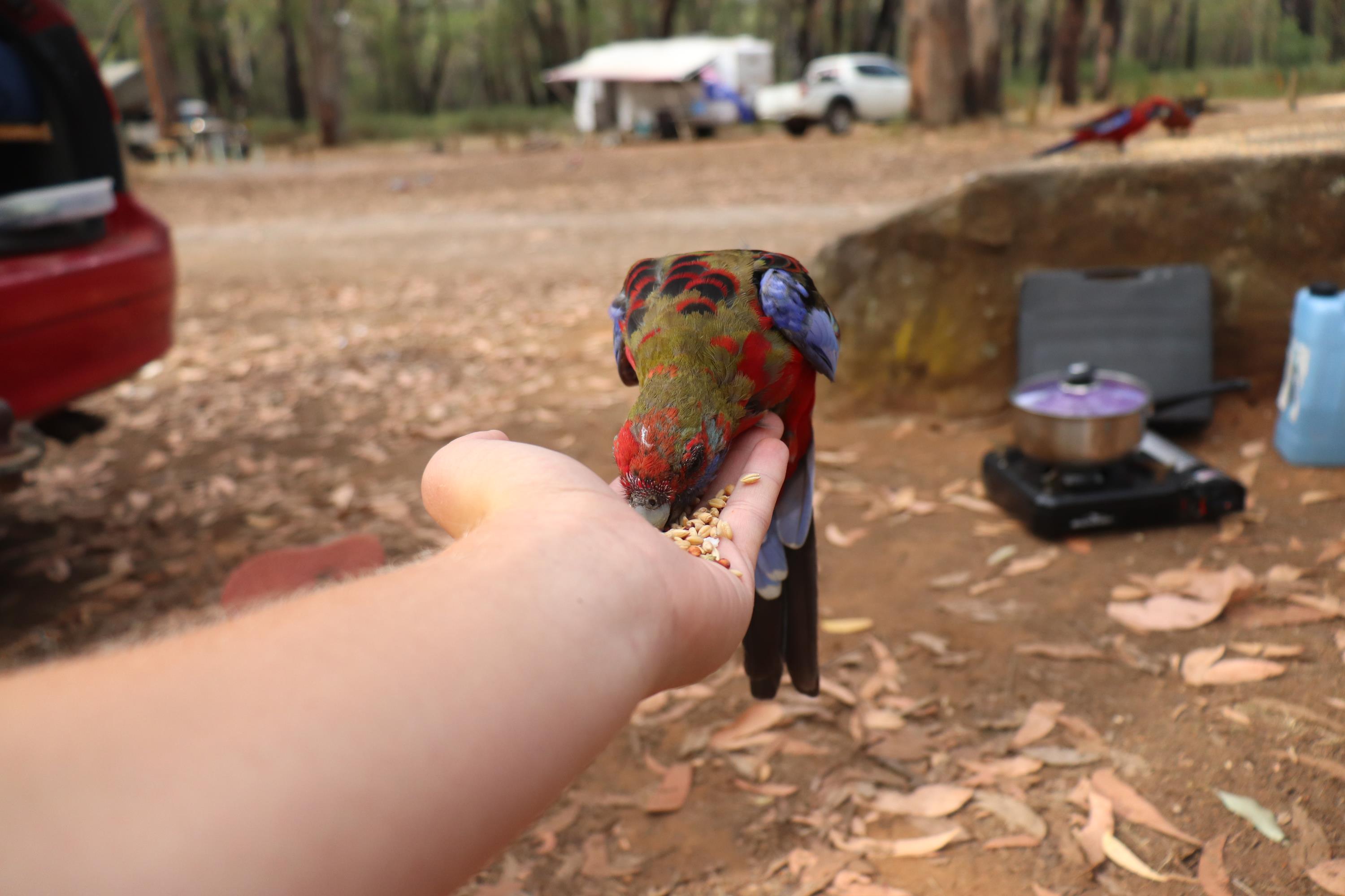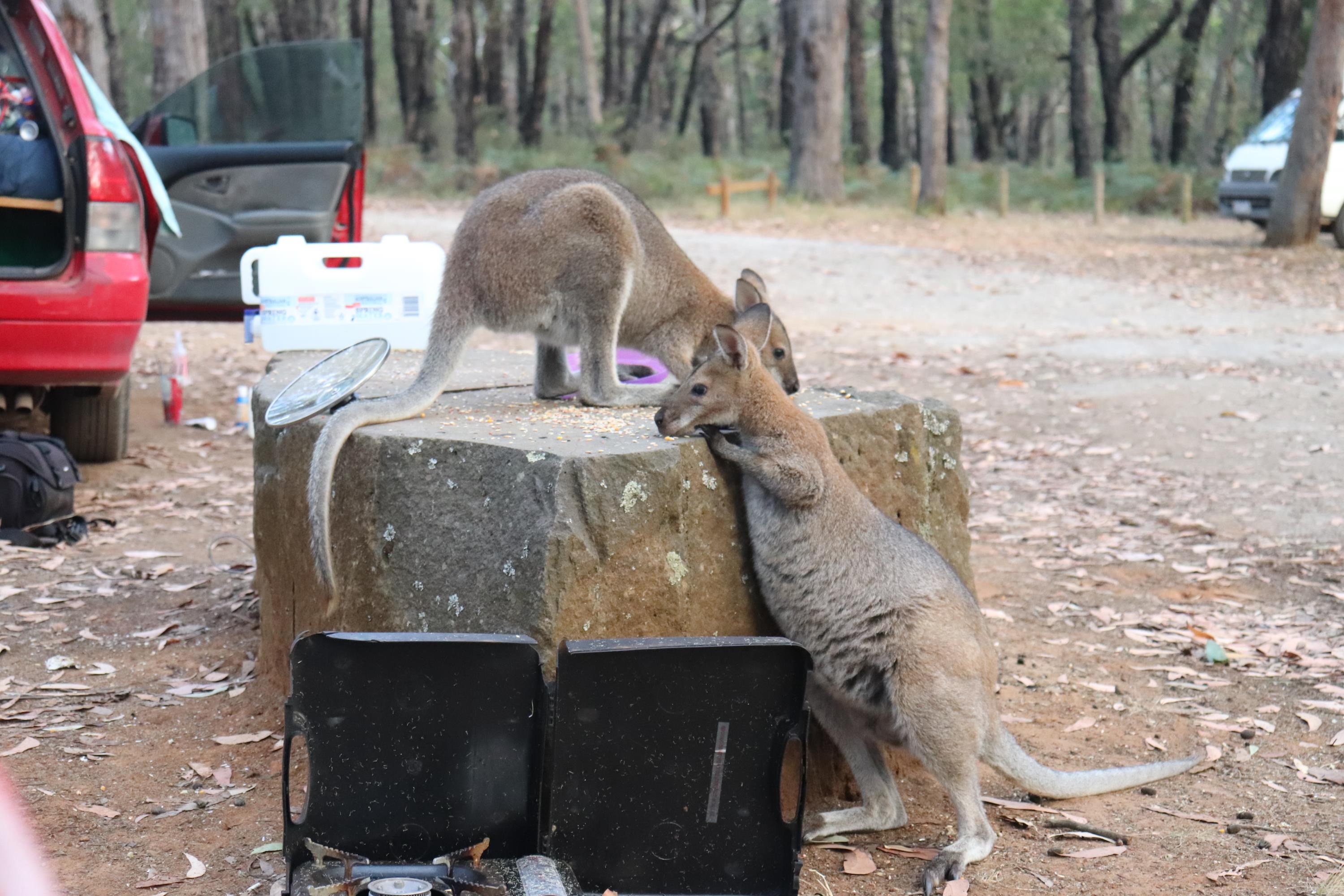 Morgens wurde ich wieder wach durch ein knusperndes Geräusch wach, welches wieder von einem hungrigen Wallaby erzeugt wurde, das sich an der Vogelfutterstange (eigentlich ja, wie der Name sagt, für die Vögel gedacht) gütlich tat. Die Pennantsittiche ließen es sich allerdings nicht nehmen, die Krümel vom Wallaby zu gustieren.😁