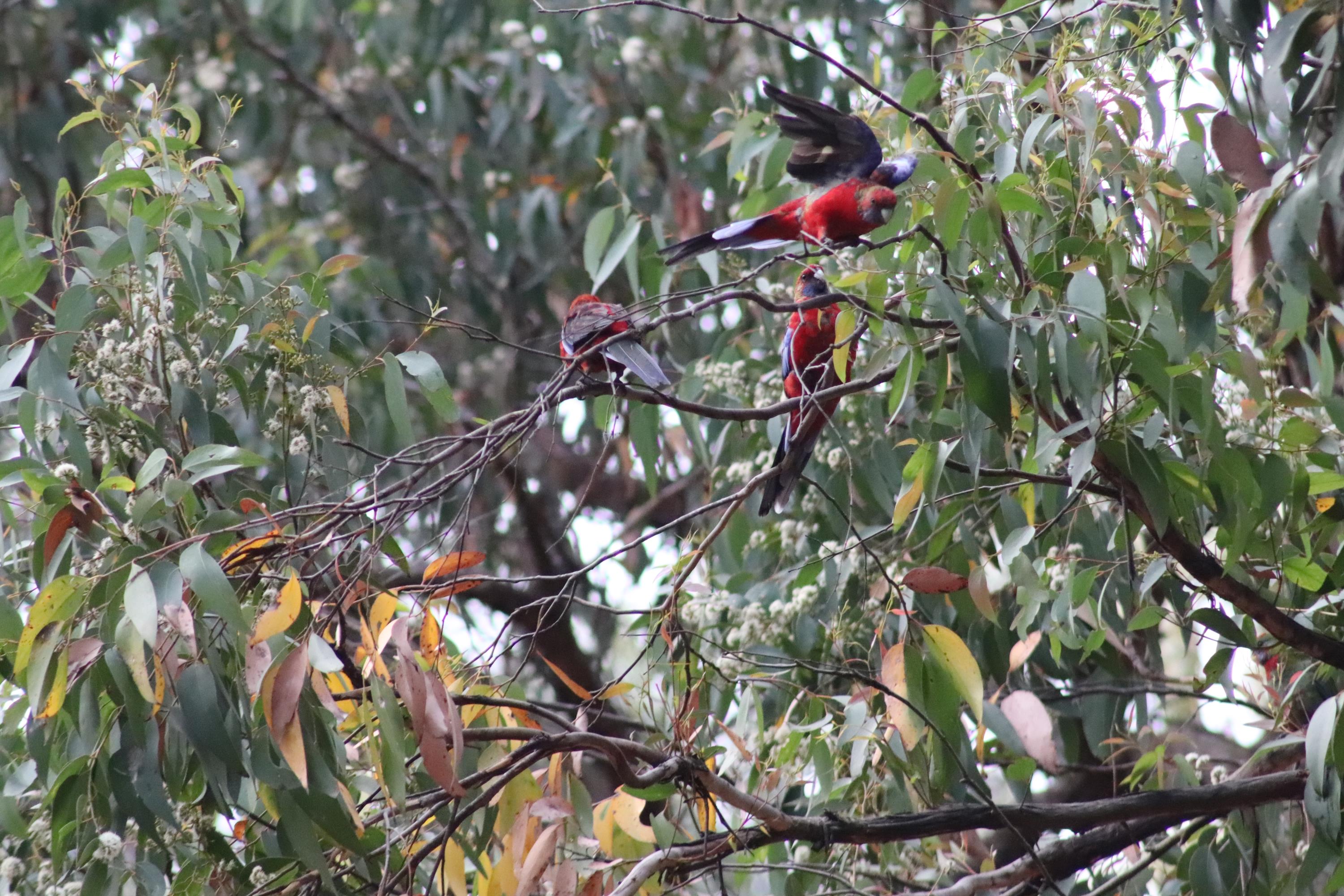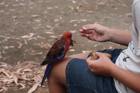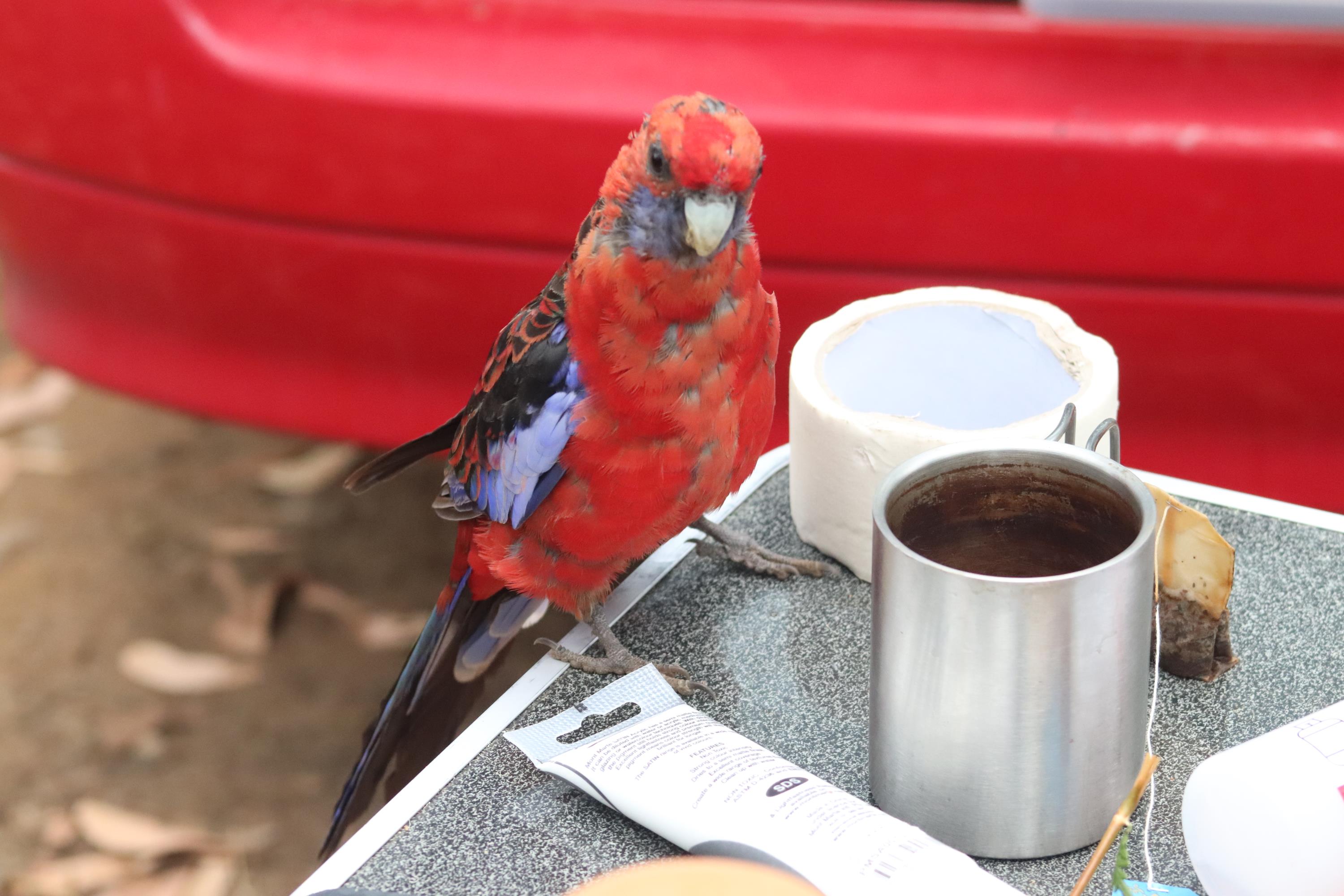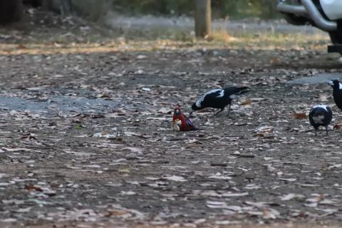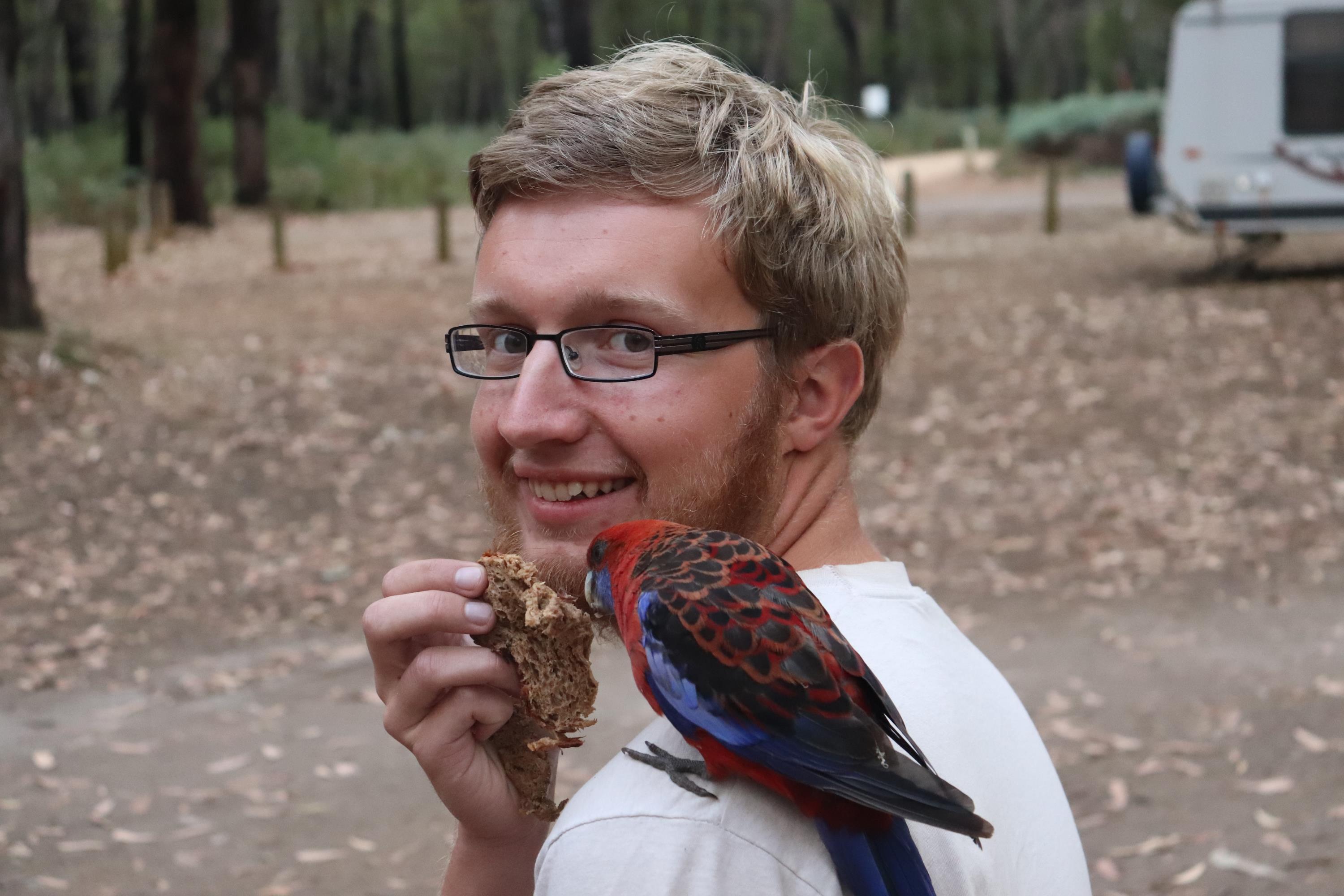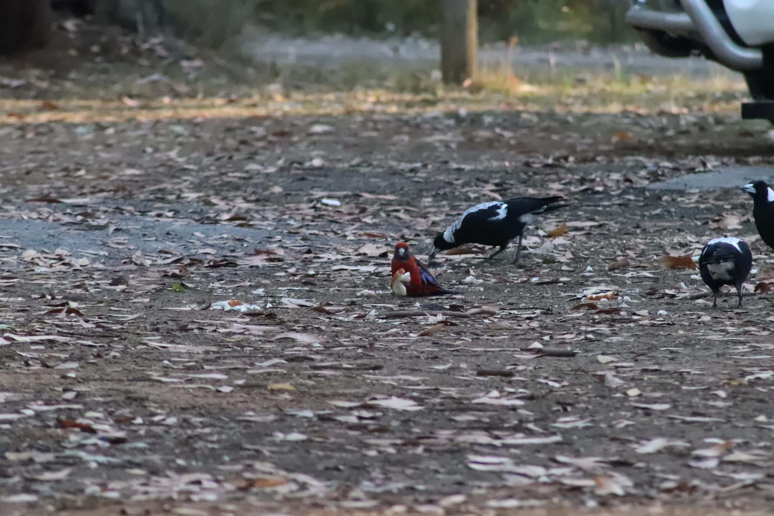 Morgens wurde ich wieder wach durch ein knusperndes Geräusch wach, welches wieder von einem hungrigen Wallaby erzeugt wurde, das sich an der Vogelfutterstange (eigentlich ja, wie der Name sagt, für die Vögel gedacht) gütlich tat. Die Pennantsittiche ließen es sich allerdings nicht nehmen, die Krümel vom Wallaby zu gustieren.😁