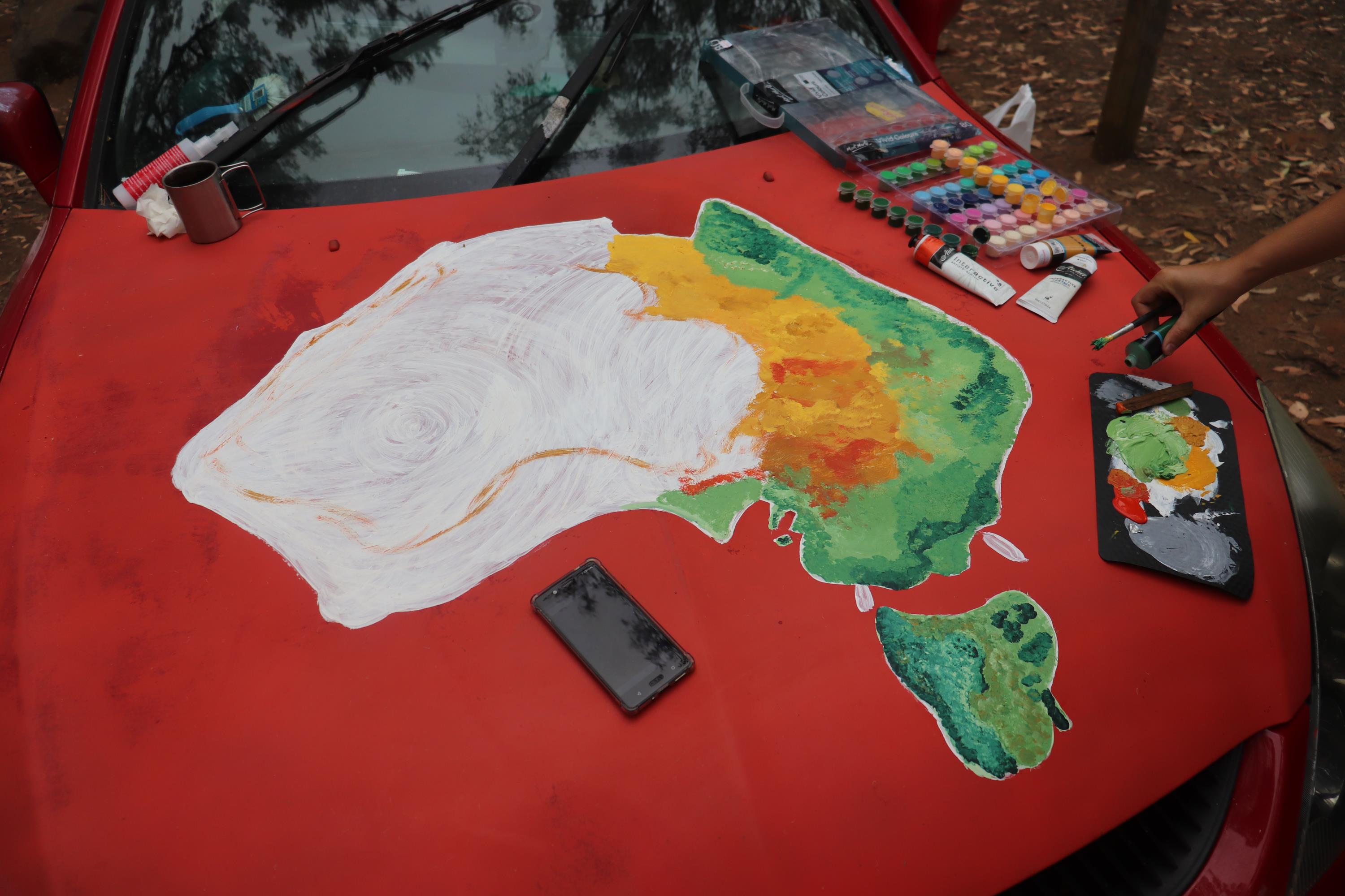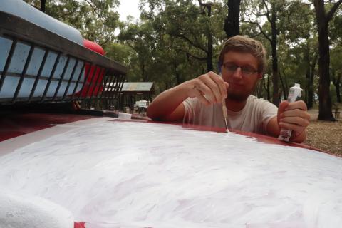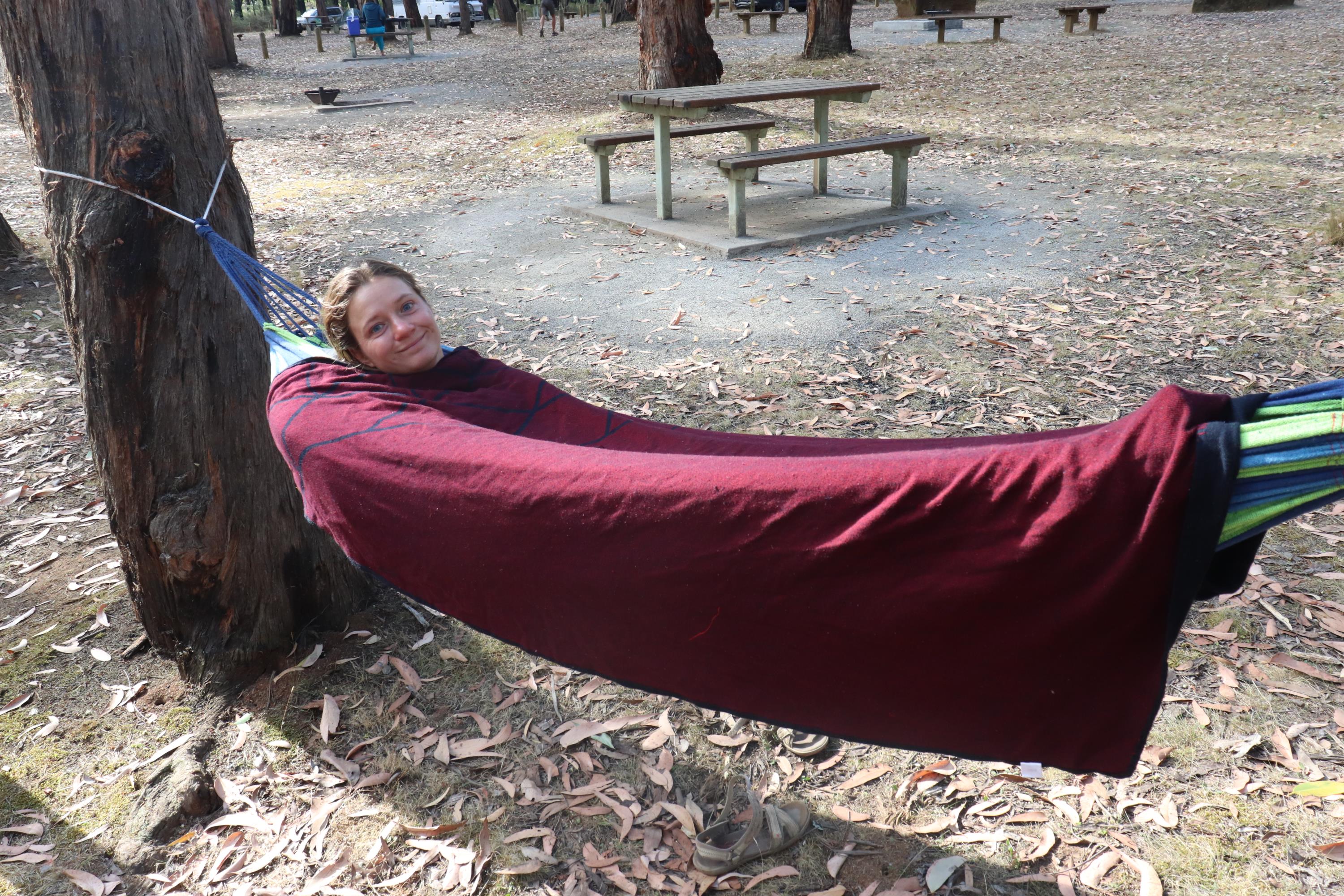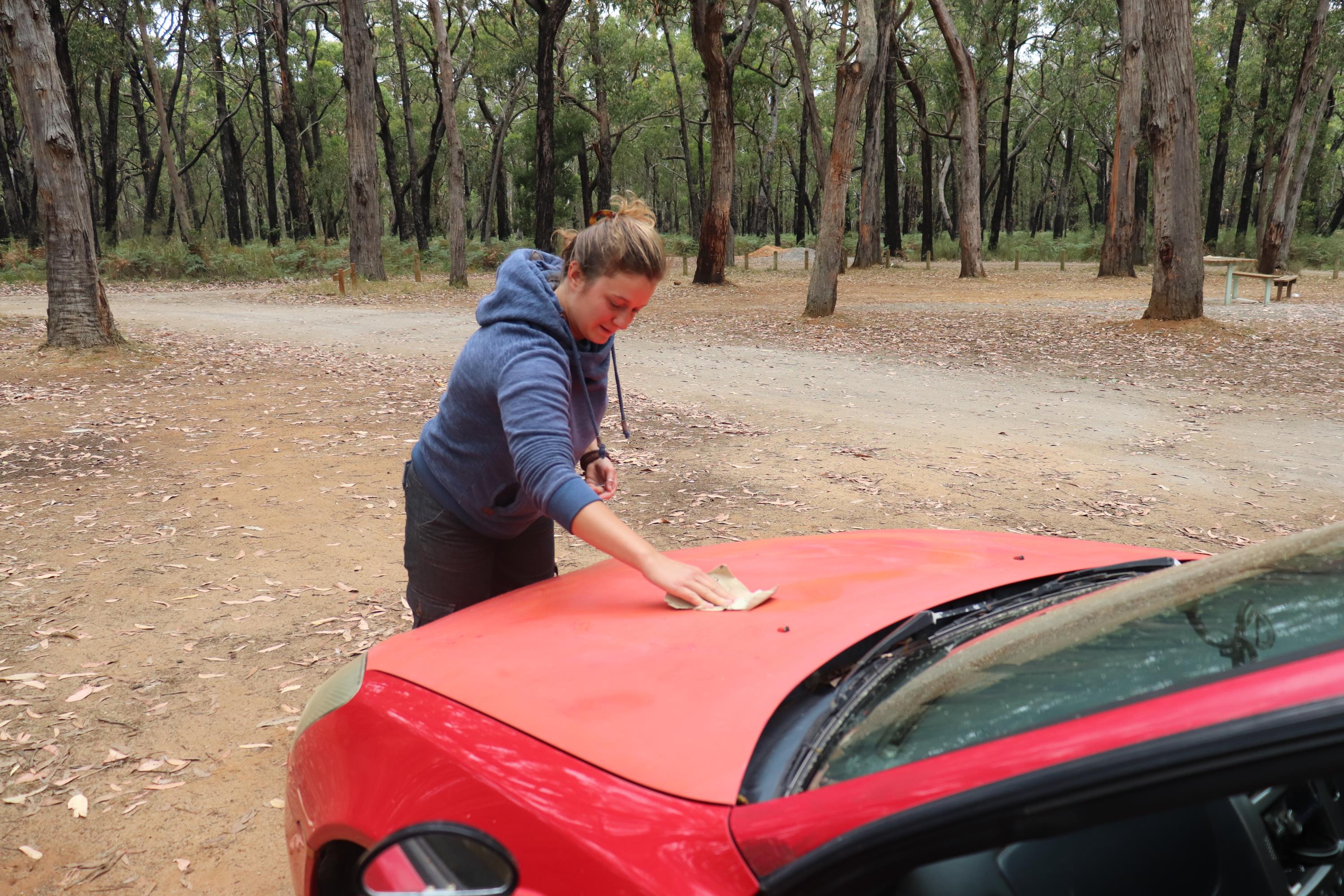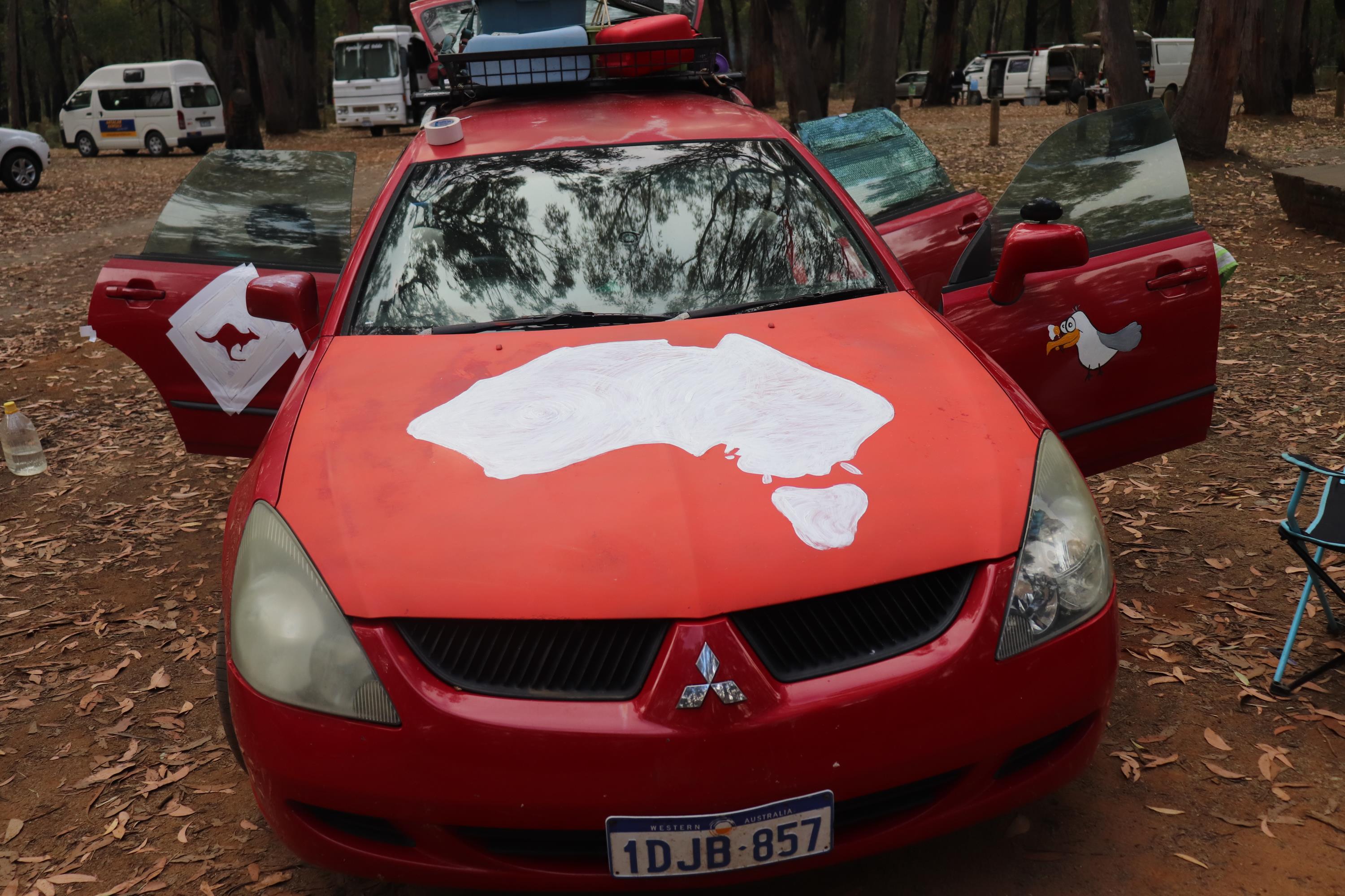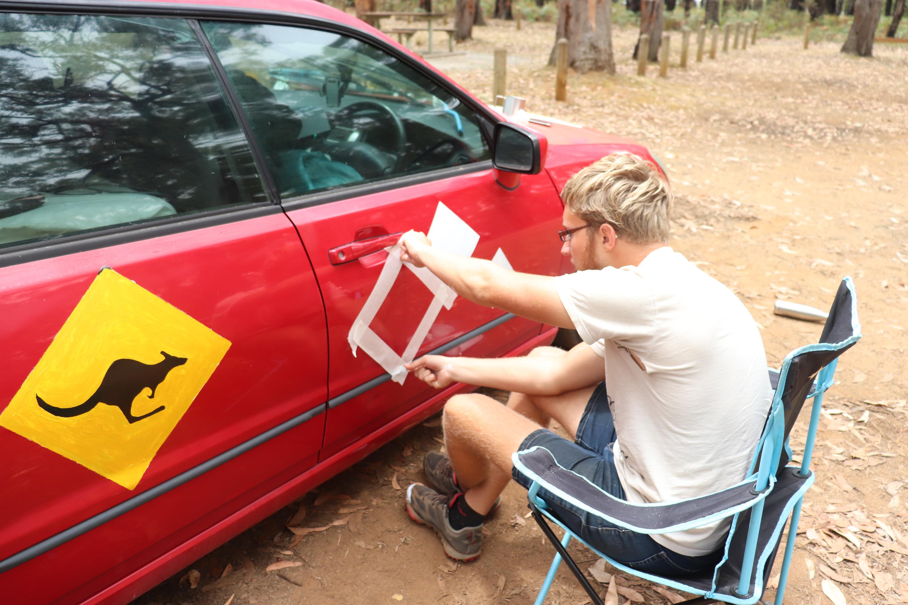 Den restlichen Tag über lag Philip in der Hängematte und ruhte sich aus. Während ich mir Gedanken über die Umdekorierung unseres Vehikels machte und die Motorhaube abschliff und grundierte. Auch eine der hinteren Seitentüren bekam ein neues Motiv. Ein Känguru Warnschild. Viele Leute besuchten uns zwischenzeitlich auf unserem Teil des Campingplatzes und so hatten wir heute einige spannende Konversationen. Allgemein sind die Aussies hier sehr gesprächsfreudig. 👍👍