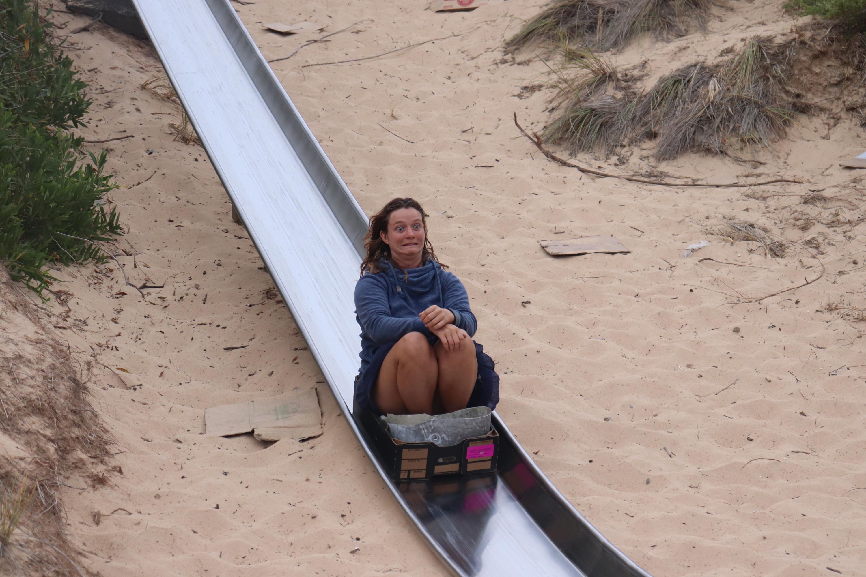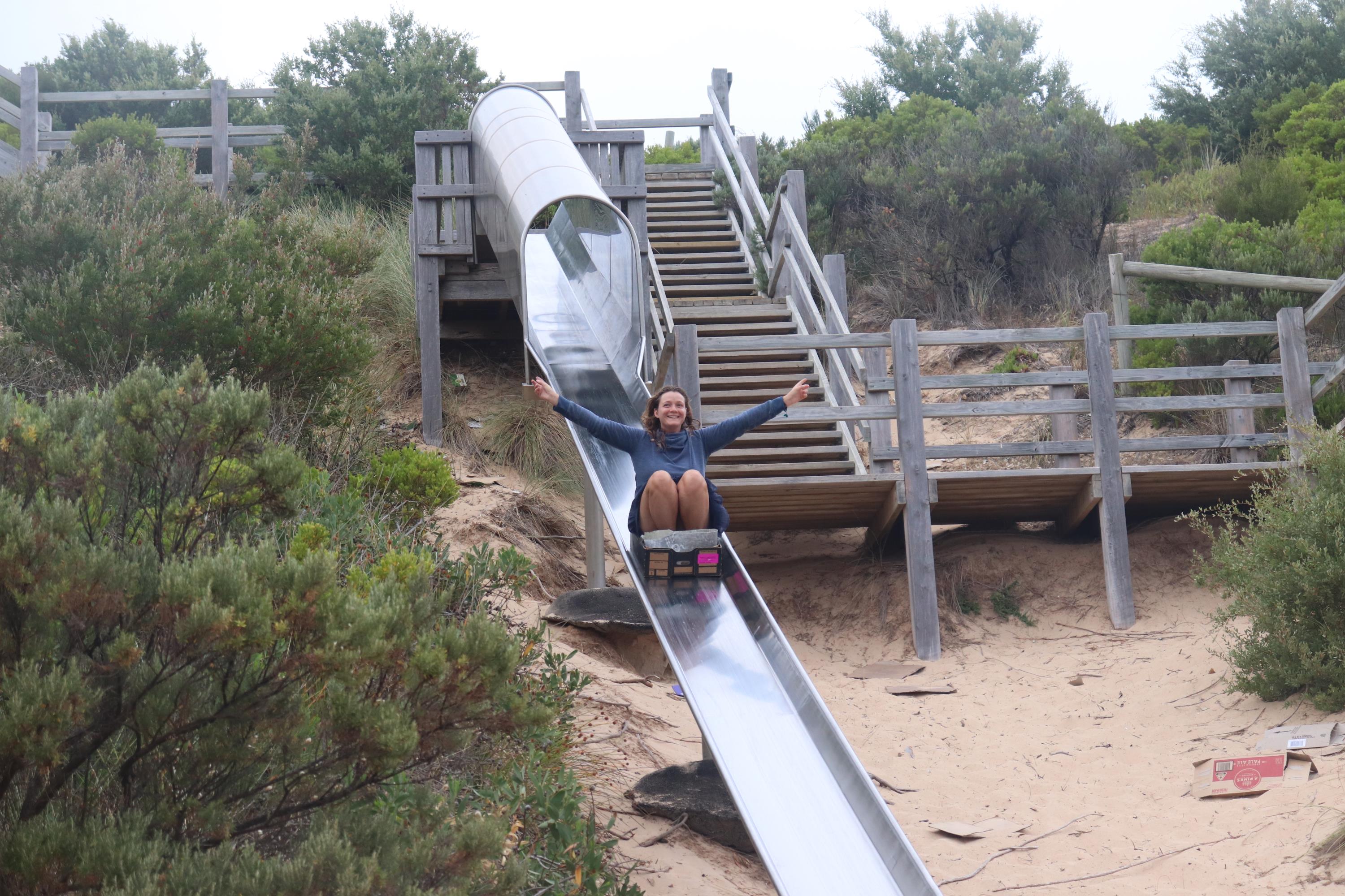 Mit einem kurzen Zwischenstopp bei einem Fred Feuerstein Auto fuhren wir bis zur ‘Big Yambuk Slide’, einer schönen langen Rutsche mit Blick auf das Meer. Dort hatten wir unseren Spaß und rutschten, was das Zeug hält.