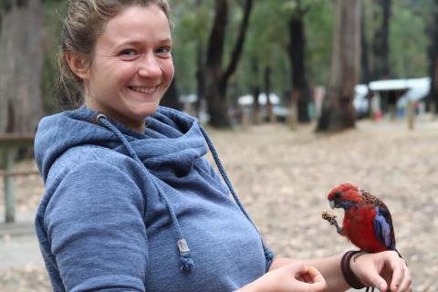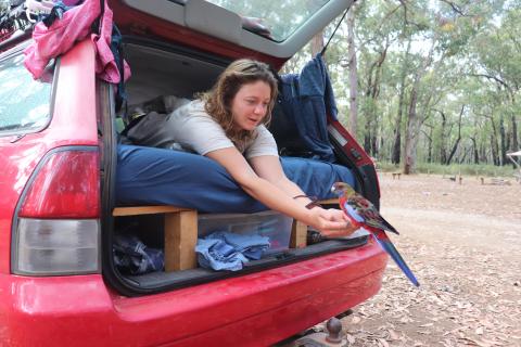 Beim Frühstück gaben wir den Sittichen etwas Brot, was diese zum willkommenen Anlass nahmen, um auf unsere Hände und Arme zu fliegen und uns als Sitzstange zu nutzen.😎 Damit ist dieser Campingplatz nun unser absoluter Favorit.