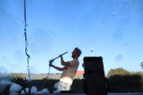 Auch spülten wir das Auto kurz ab, da es sich mit Staub überzogen nicht zum weiteren geplanten Bemalen eignet. Heute war Philip mit der Autowäsche dran und er dachte sich wohl: ‘Na wenn ich schonmal dabei bin, kann ich mir ja gleich die Haare mit der Spritzdüse waschen.’ Gedacht, getan! 🤣