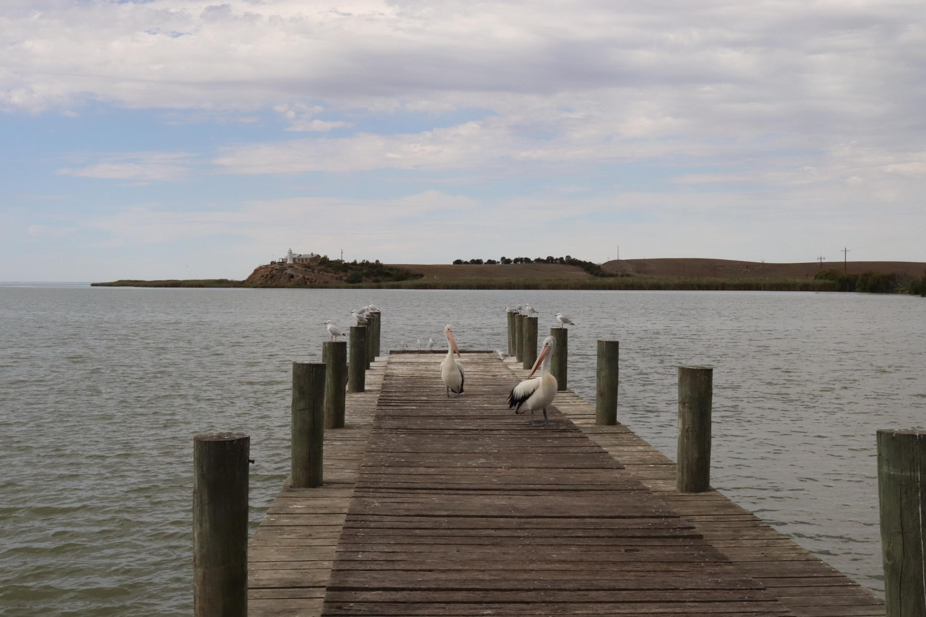 Überraschenderweise setzten wir mit einer kleinen kostenlosen Autofähre zu unserem Campingplatz ‘Narrung Ferry Landing Camp Area’ über. Dort suchten wir uns auf dem gemütlichen kleinen grünen Plätzchen eine Schlafbucht und wanderten zum Steg, weil es dort von Seevögeln, vor allem von Pelikanen wimmelte.😁