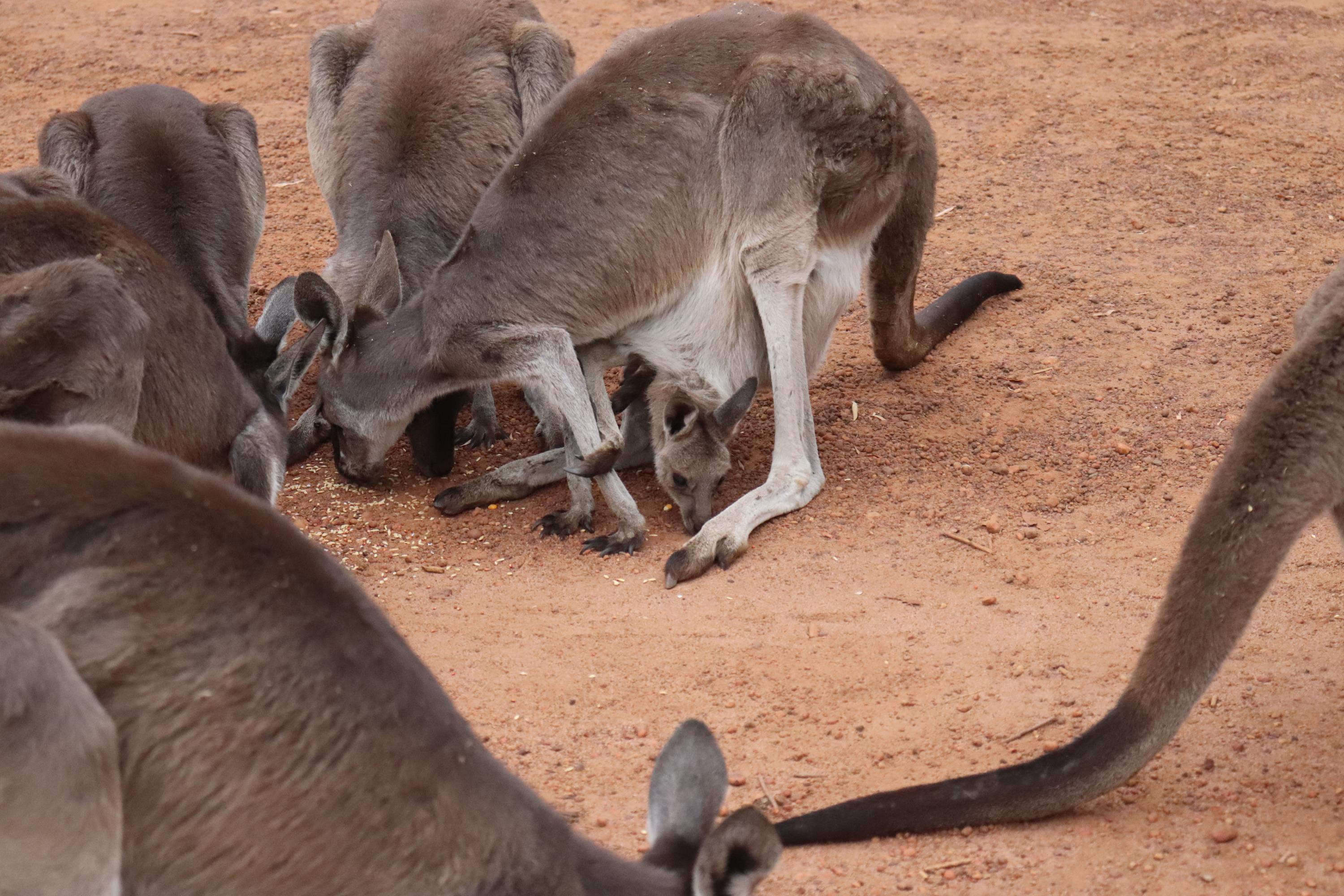 Eine Besonderheit gab es dann zum krönenden Abschluss. Ein Feriendorf, das ‘Donnelly River’ Feriendorf, in dem es viele zahme westliche graue Riesenkängurus und Emus geben sollte, die dort frei herumlaufen. Die Kängus trafen wir dort zahlreich an. Keine Emus ließen sich blicken, aber jede Menge kleinerer Vögel, die sich in den aufgestellten Wassertrögen badeten. Darunter der ‘Graufächerschwanz’. Die Kängus freuten sich über Streicheleinheiten und natürlich etwas Vogelfutter. So verbrachten wir einige Zeit dort umgeben von den flauschigen ultraweichen Gesellen, die zwischendurch unsere halbe Vogelfutter Packung zerkratzt und stibitzt hatten, bevor es uns zu einem herrlich leeren kleinen Campingplatz führte.
