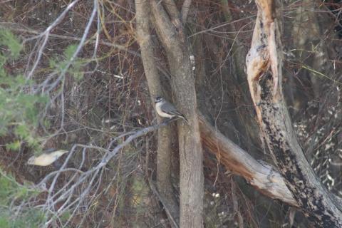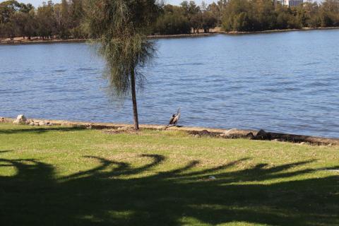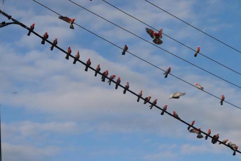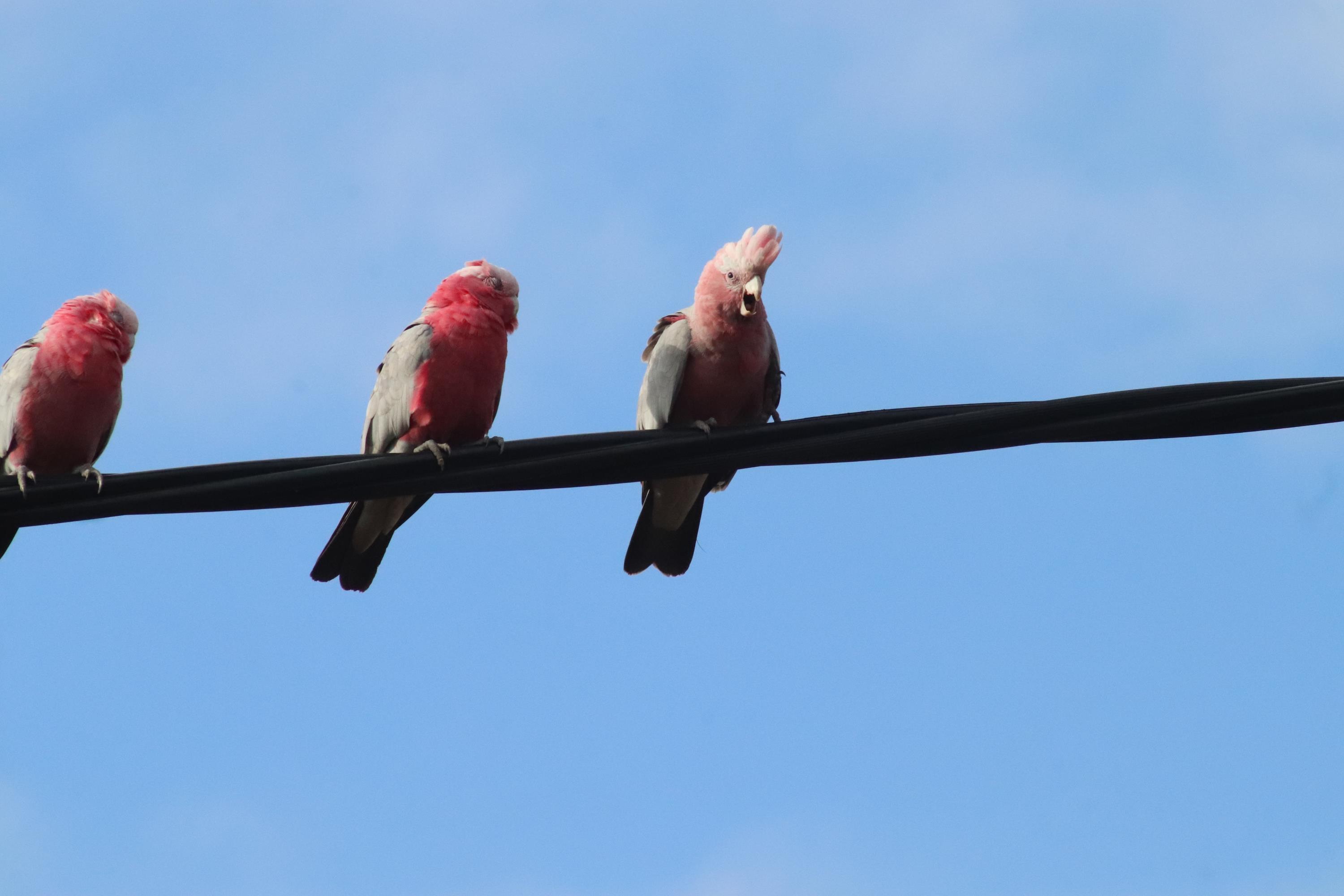 In einem kleinen Park legten wir eine Mittagspause ein und hatten das Glück, zur Fütterungszeit da zu sein, als eine Frau in ihrem Vorgarten einen ganzen Schwarm an Rosakakadus fütterte. Auch eine ‘Bronzeflügeltaube’ und eine ‘Spitzschopftaube’ verirrten sich gurrend zwischen die gierigen Gesellen.