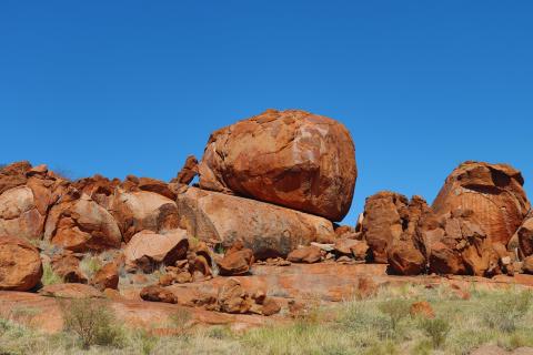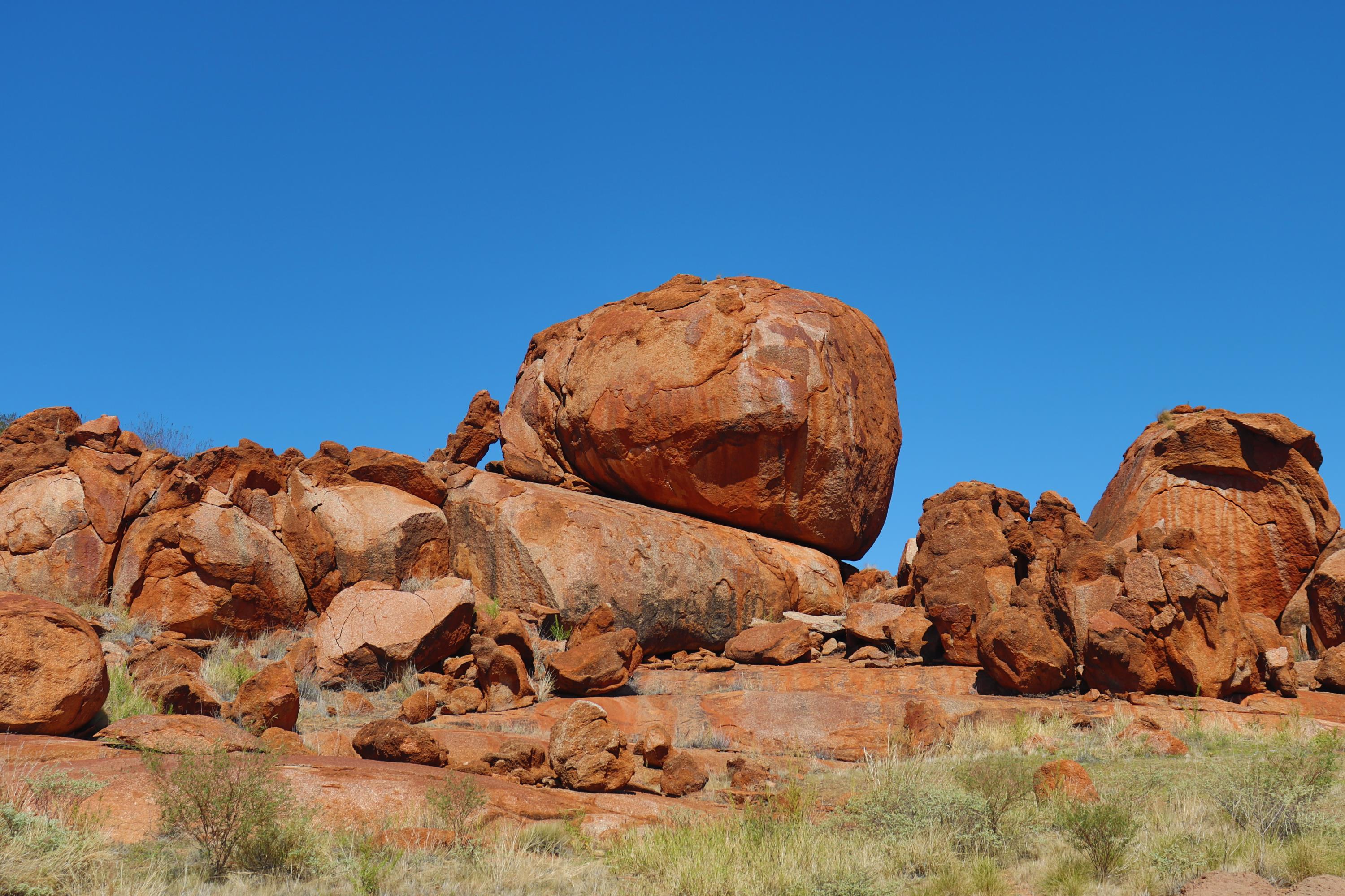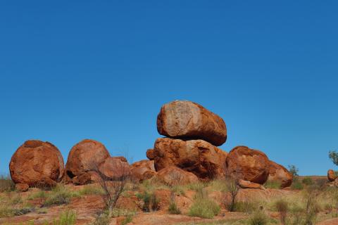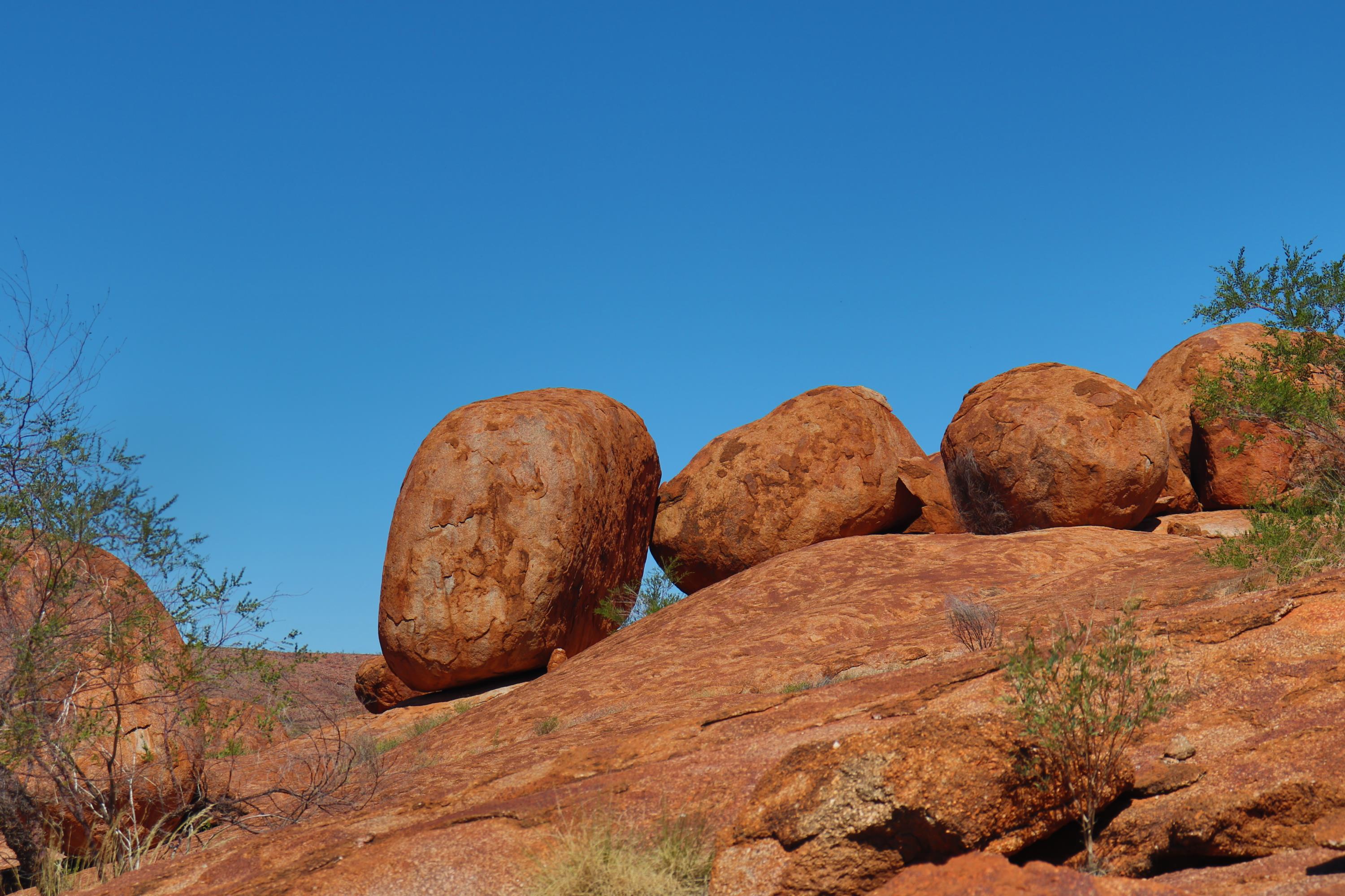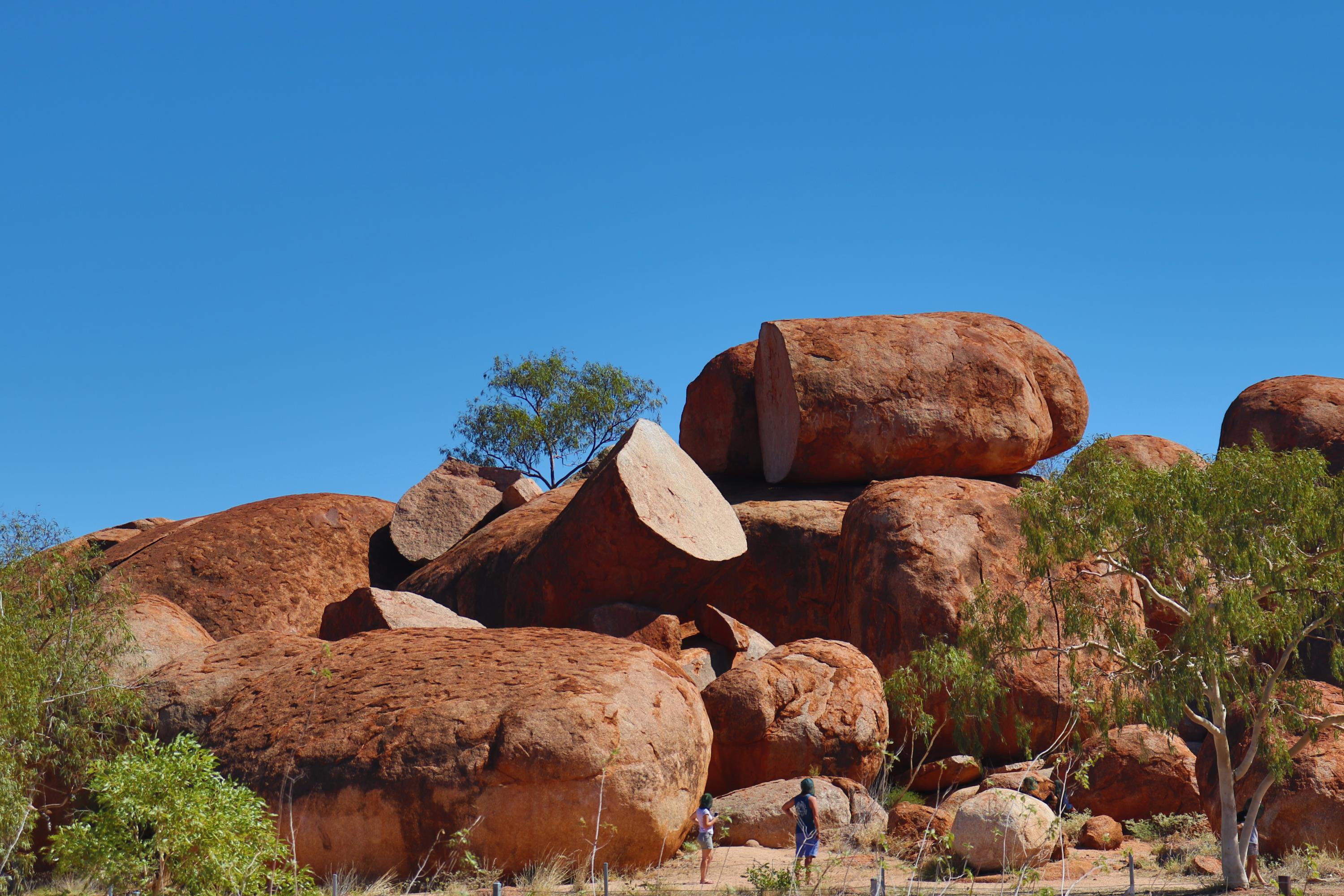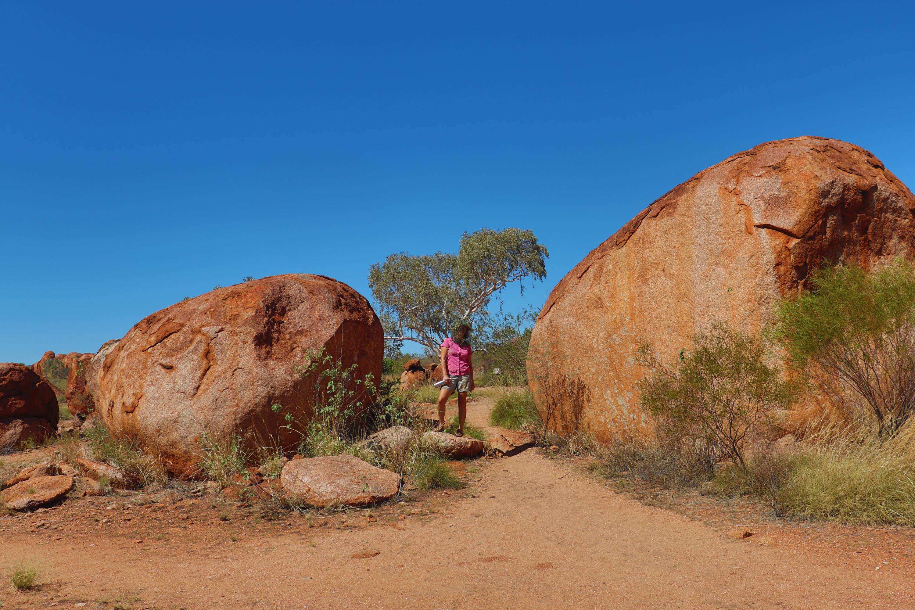 So gekräftigt fuhren wir weiter zu den ‘Devils Marbles’, den Teufels Murmeln. Eine interessante geologische Formation aus Steinblöcken. Zu einem Aussichtspunkt führte uns ein kleiner verschlungener steiniger Pfad.