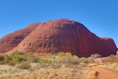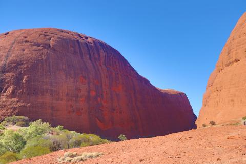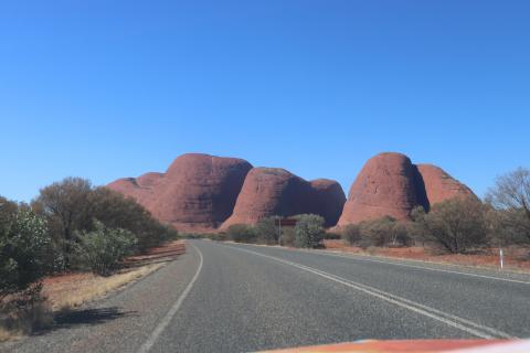 Auch dieser Morgen erwartete uns kalt und unangenehm. Wir waren heute nicht in Wanderstimmung weshalb wir einen ruhigen Tag einlegten. Wir fuhren zum Resort hinüber und die Mittagsstunden verbrachten wir an den ‘Olgas’ oder ‘Kata Tjuta', wie sie die Aboriginals nennen. Ein Gebirgszug, dessen Silhouette wir die Tage zuvor bereits deutlich am Horizont erkennen konnten. Von Nahem sah er noch schöner aus.